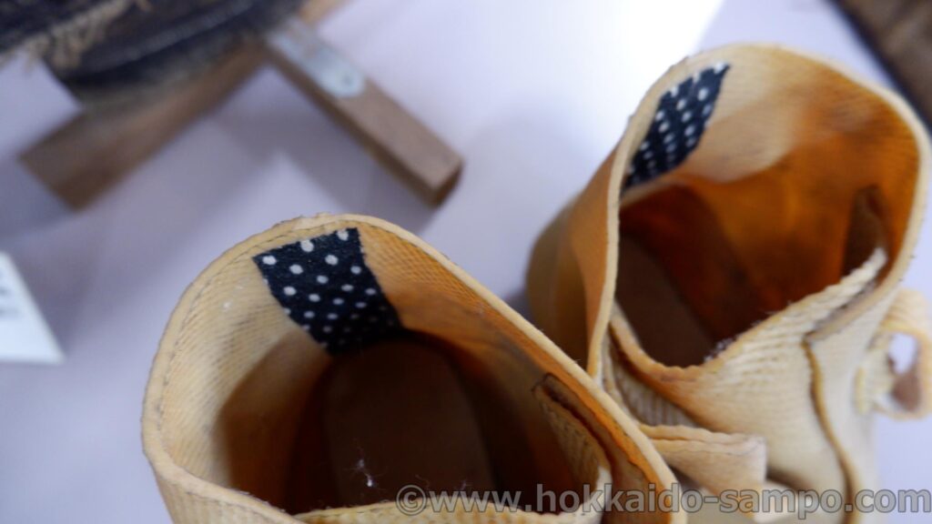 ボッコ靴はほとんどが生ゴムで作られた長靴という感じだが、これはひもが通せるようになっていて、調節が可能になっている。履き口もかなりバッファがある。当時としてもかなり良いものだったのではないかと思う。説明には『足にぐるぐると毛套を巻いてから履いた』とあった。さすがに雪の上で長時間作業するにはその方が暖かそうだ。