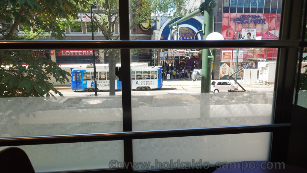 窓の向こうに街灯、街路樹、狸小路商店街のアーケード、道行く人々、そして何より市電が通る風景を見ながらコーヒーが飲めます