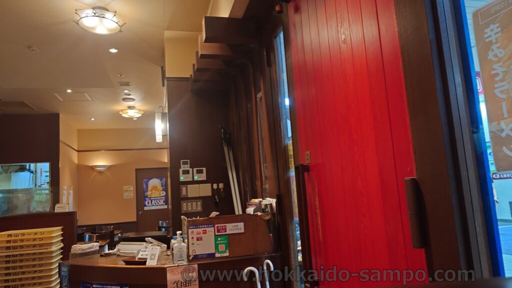 赤いドアが目印です。麺は間違いのない西山製麺のようですね(画像に見えている箱より)。