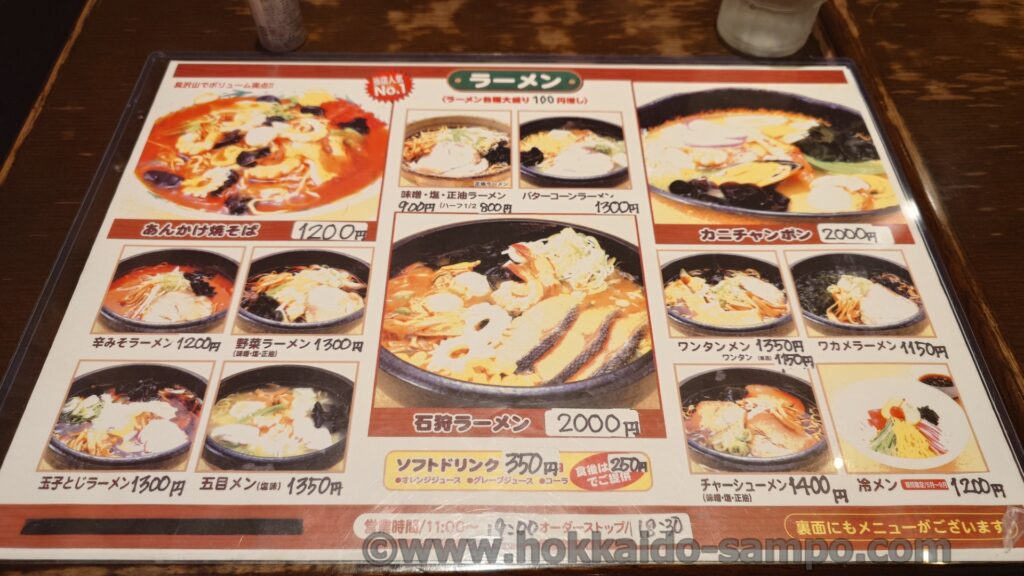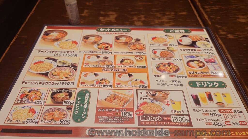 中央上に味噌・塩・醤油ラーメン900円とあります(ハーフ800円)。1000円の壁をぎりぎり超えずにやってくださってます(2025年時点)。そして私個人的なおすすめもこの900円のシンプルなラーメン。今や貴重となりつつある王道の味噌ラーメンが食べられます。他のお客さんから聞こえてくる注文としては塩も人気のようでした。
