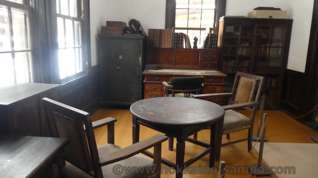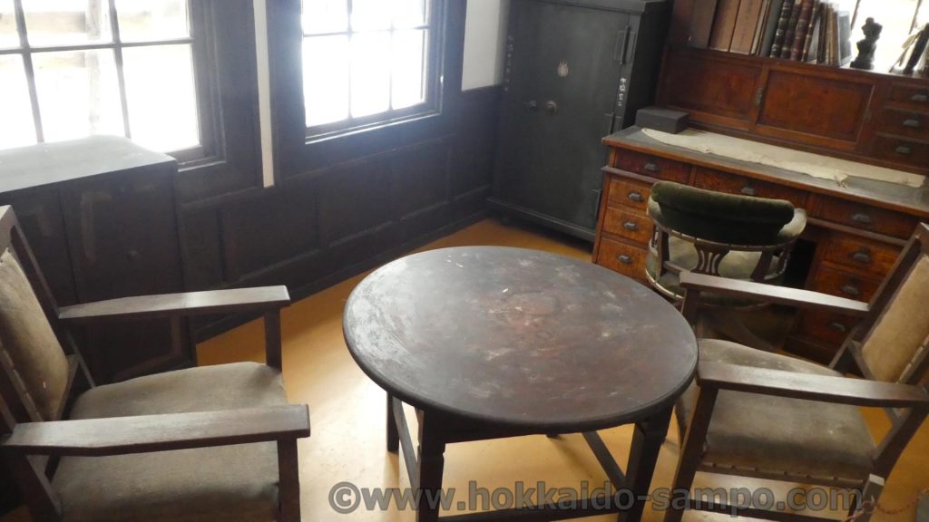 よく見ると左は金庫のようでもちろん重厚な造りで鍵付き、机の引き出しと棚もほぼ全て鍵付きで元情報将校であった鶴見中尉にこの上なく合っているように思う。よくぞこの机を背景に選んでくださったと言う気すらする。この家を買い取った、元の所有者である松橋家は不動産経営会社をしていたので、大事な書類がたくさんあったのだろう。