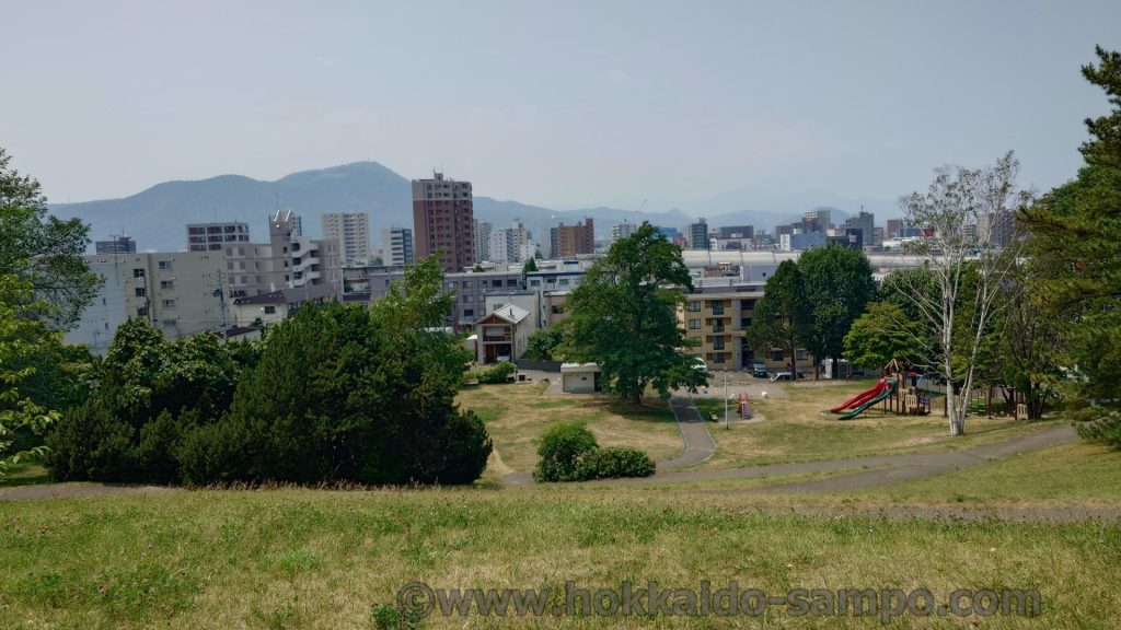 坂の上から平岸の景色を見渡すことが出来ます。この辺りも昔はりんご畑だったのでしょうか。藻岩山(左)や手稲山(右奥にうっすら)が見えています。地下鉄のチューブも見え、なんというか、「町を見渡している」といった気分。気持ちが良いところです。