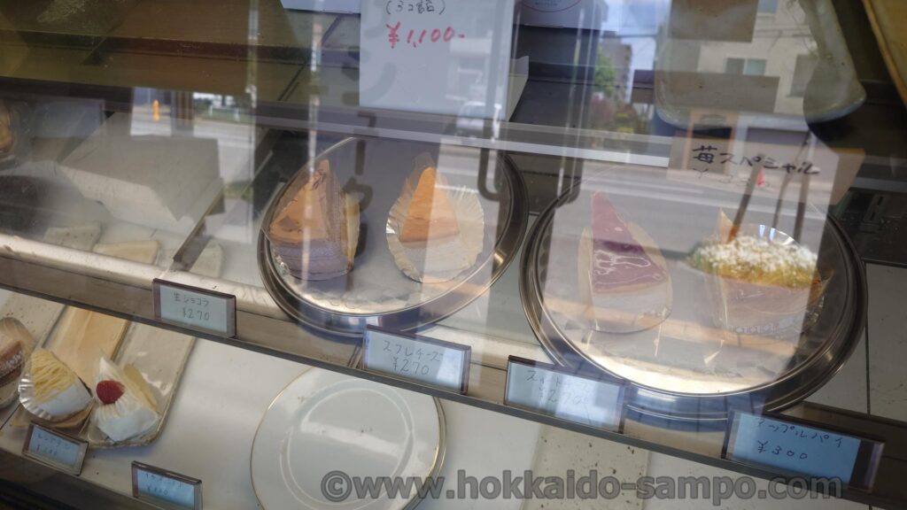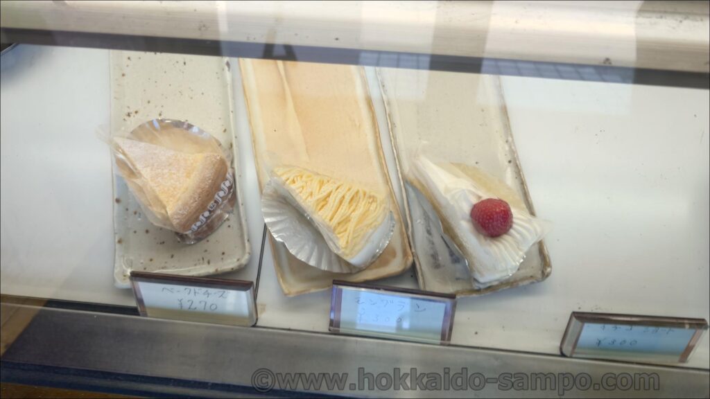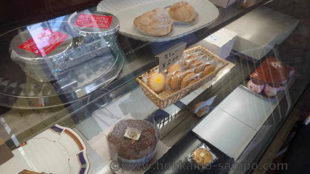すすきのにもお店があって、すすきのという場所らしく確か18時開店なのですよね。ケーキはイベントの多い歓楽街ならではの需要があるのでケーキ販売はそちらがメインなのかもしれません。本店ともいえるこちらのほうは製造所兼販売という感じで少し落ち着いていました。というかちょっと雑然としていて、照明も暗い感じ。