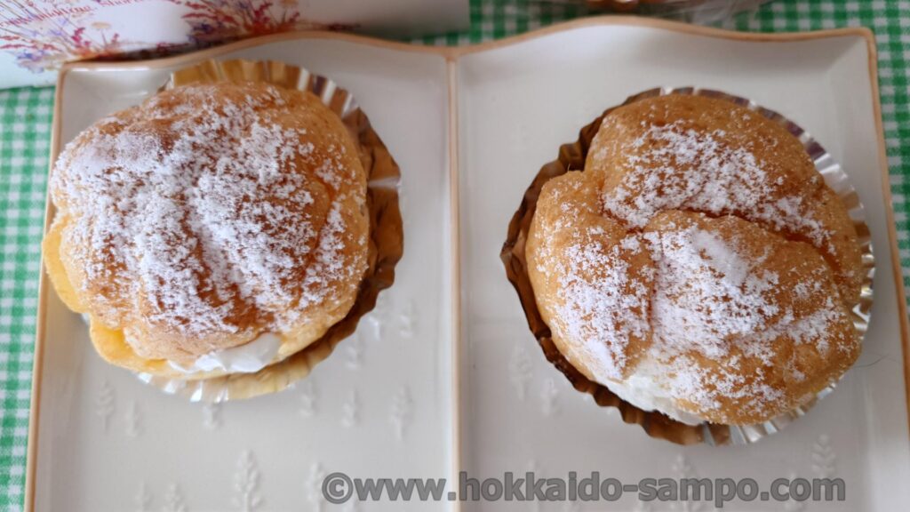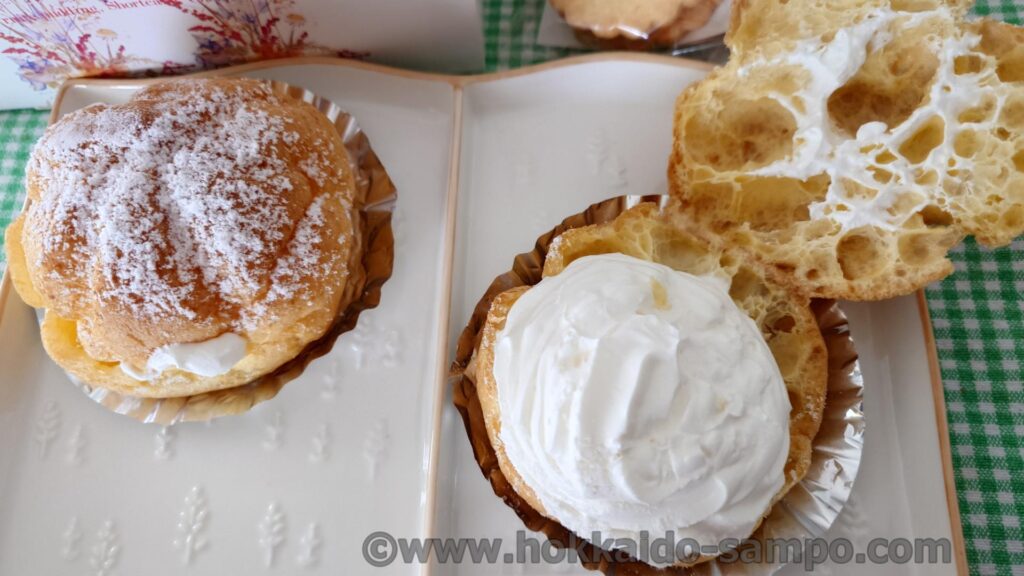 パカッと開けるとたっぷりの生クリーム。生クリームもおいしそうですが、シューの内部もこうしてみると本物という感じでおいしそうですね。実際おいしかったです