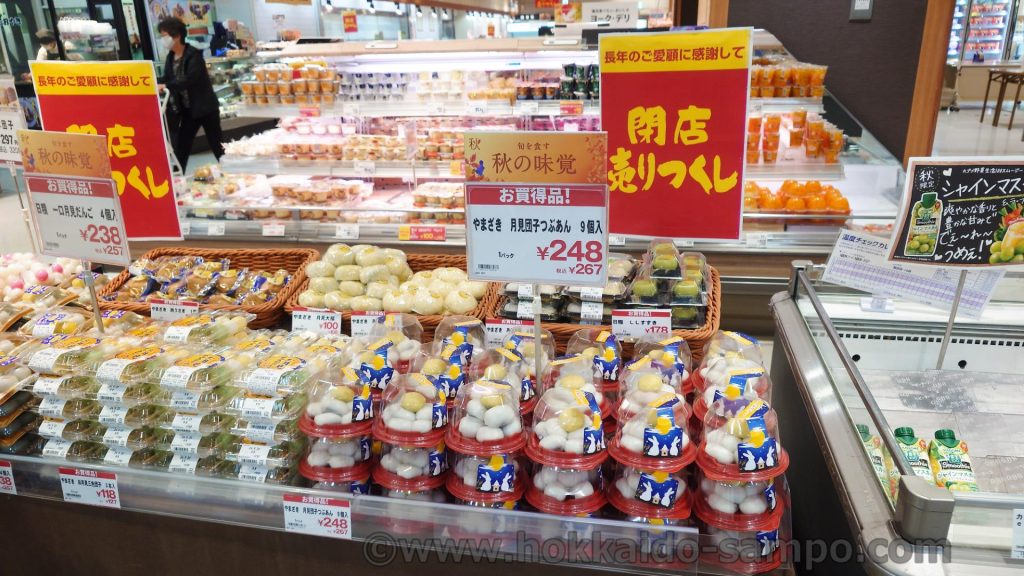 食品売り場はまだそこまで閉店モードではなく商品ぎっしりです。おつきみだんごがとてもとてもかわいかった。