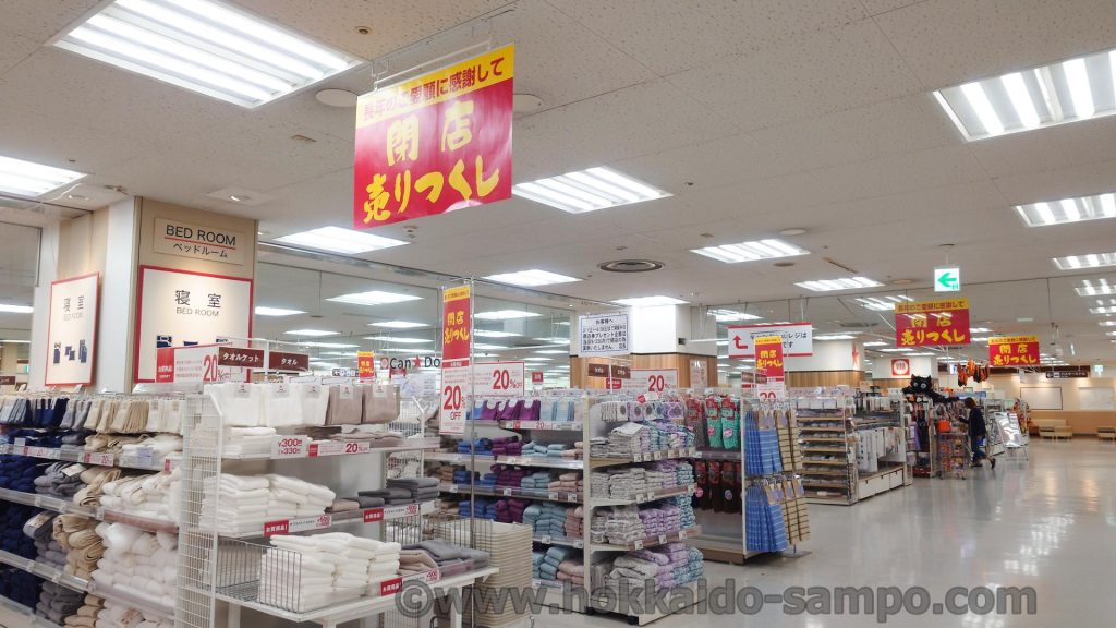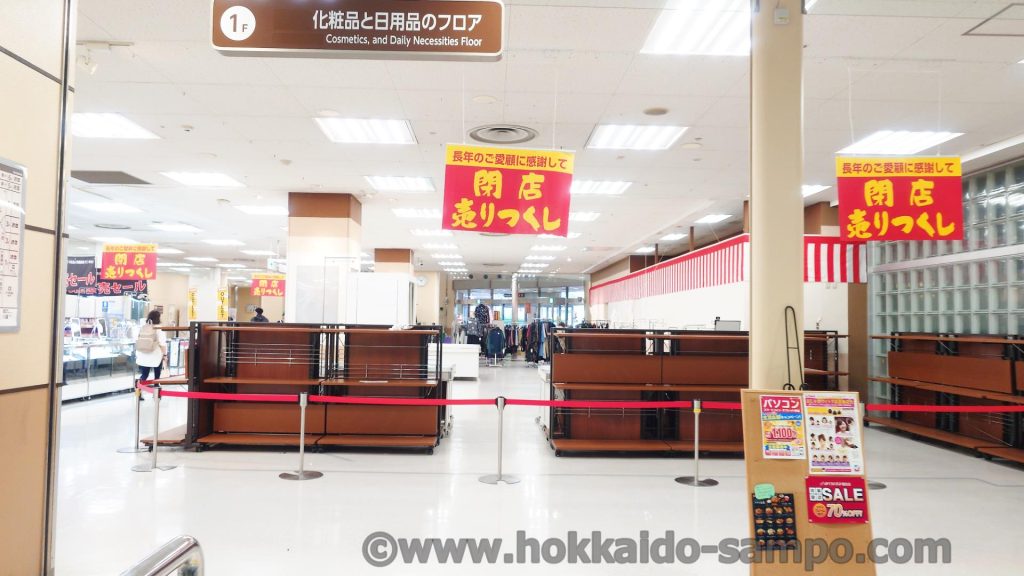 閉店売り尽くし の垂れ幕が並ぶ店内