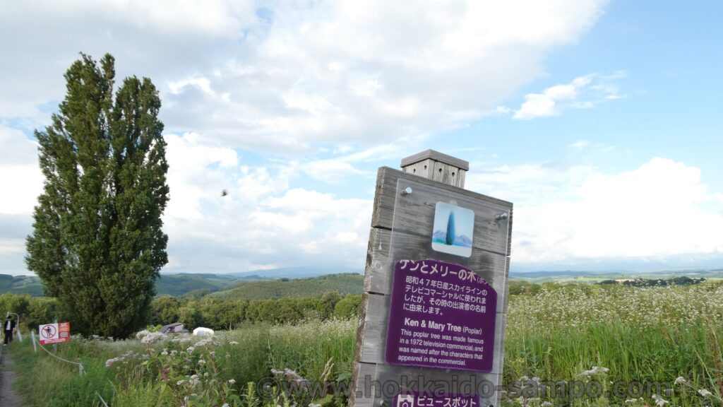 しかし、美瑛にはCMに使われた木が多く、おもしろいことに木の知名度だけが残っているけどそのCM自体はもはや誰も知らない状態のものがありますね。たとえばケンとメリーの木を訪れている人のほとんどはケンとメリーの日産のCMを知らない人がほとんどです。私もでした。周囲に聞いても「CMに使われたらしい」以上のことはおそらく聞けないでしょう(笑)。そのあたりはガイドブックもさほど詳しく触れていません。セブンスターの木はもっとそれが顕著です(笑)。セブンスターの木は別の機会にまた。