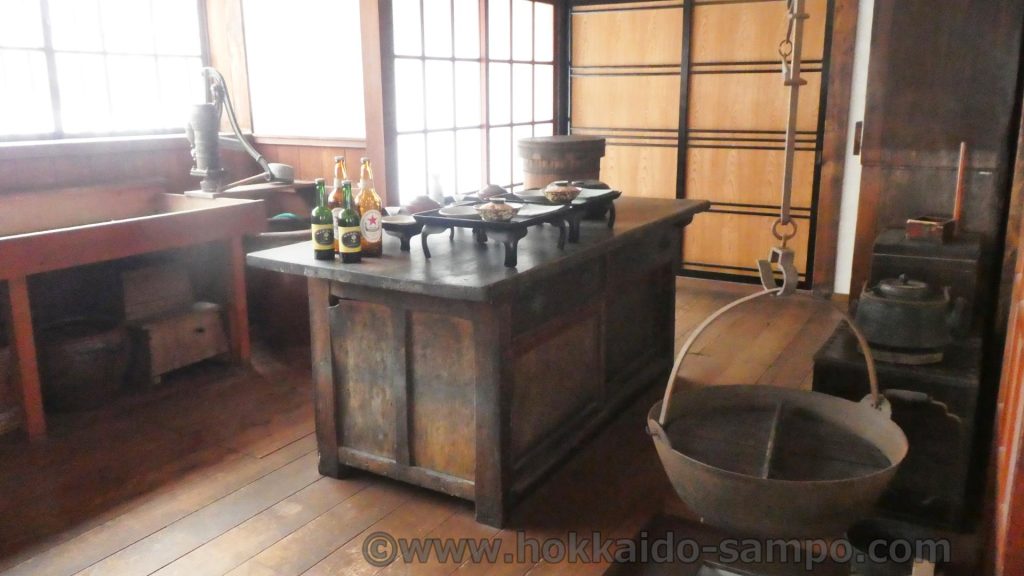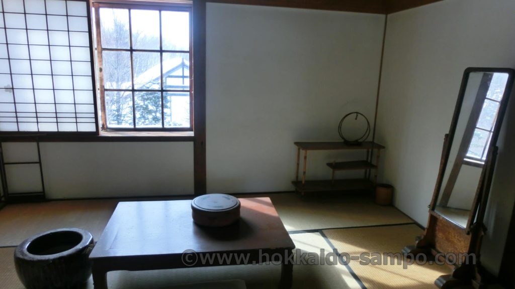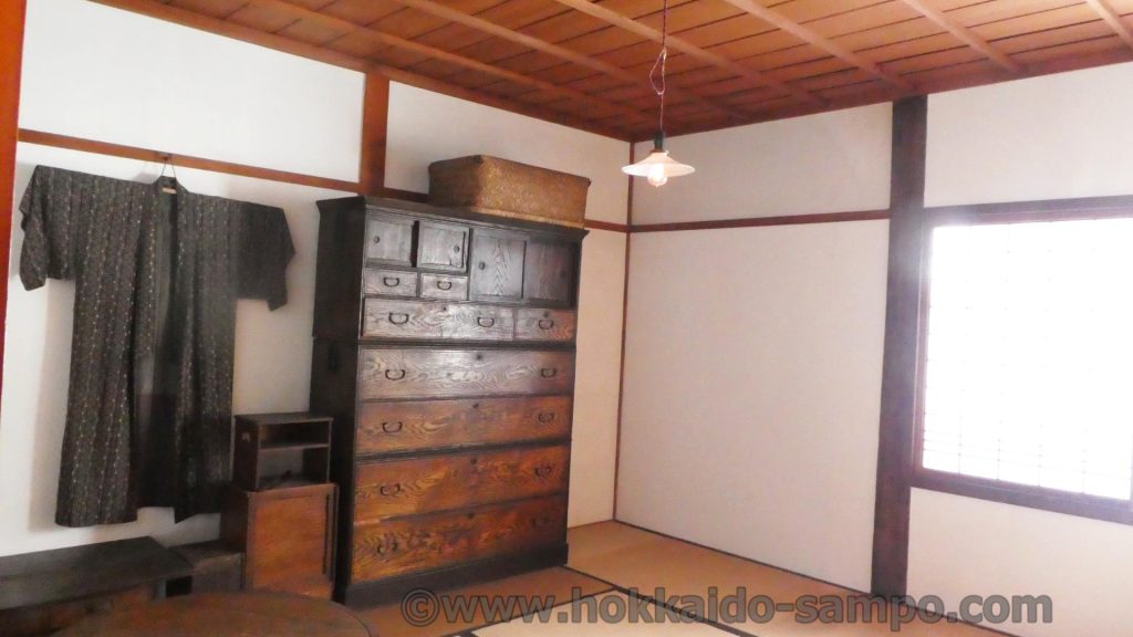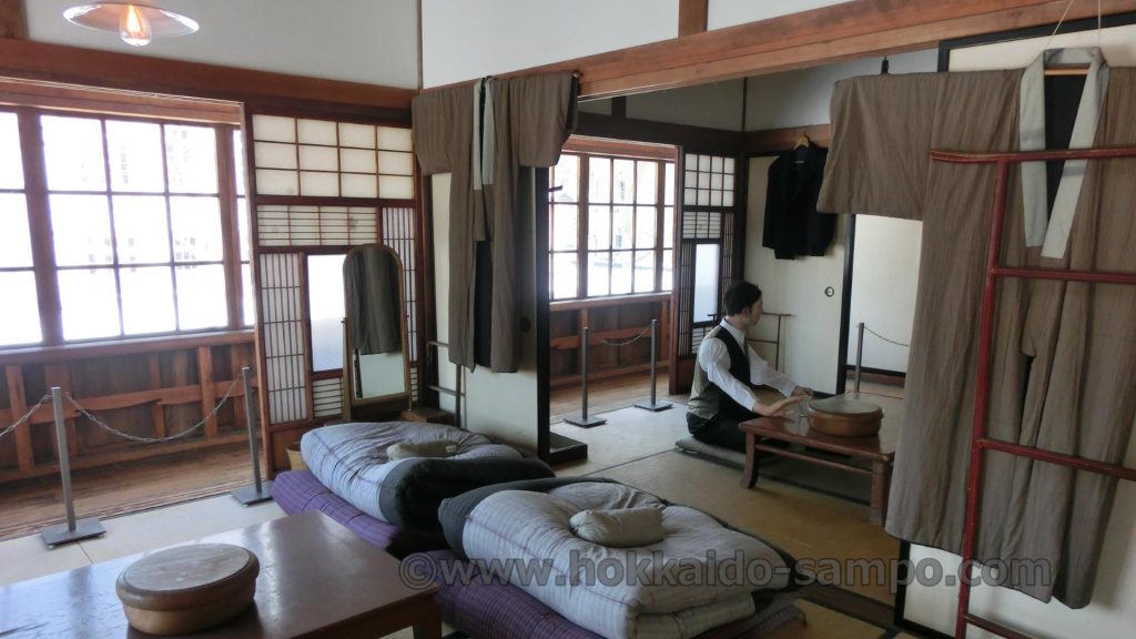 こちらの待合旅館「来正旅館」が現在置かれている開拓の村内には、鰊御殿もあるので、鰊御殿のヤン衆と親方家族の住居の別れ具合と環境の違い(親方家族部分は豪華)を見てきたあとだと余計にこの宿は良心的経営な感じがひしひし伝わる。二階の客室には違い棚などがあしらわれた良い部屋も用意されている。昭和2年、一泊二食付きさらに昼の弁当付きで代金は1円50銭だったそう。同じ旭川にあって初の洋風ホテルは一泊特等5円、食事が2円50銭とのことなので相当良心的価格。