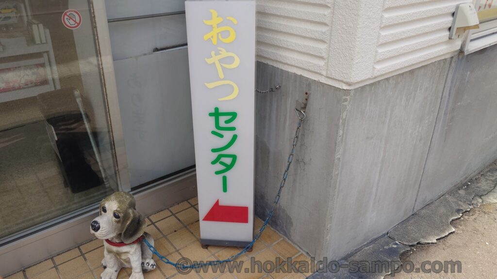 お店の外にあったかわいい看板とかわいい看板犬。おやつセンター!いいですね。