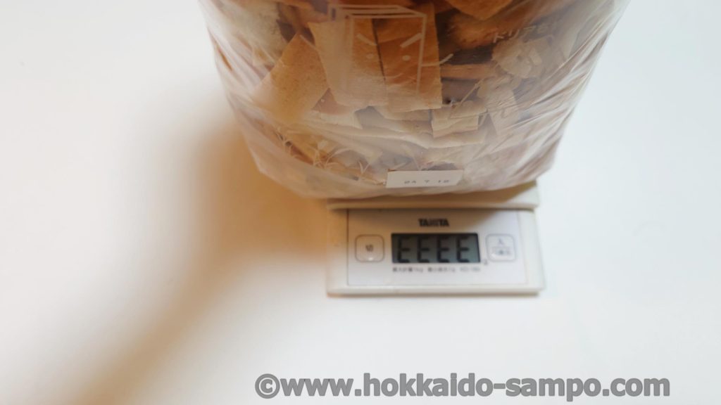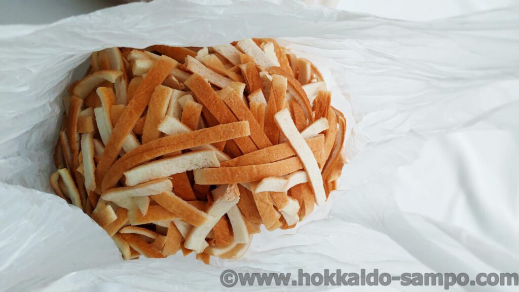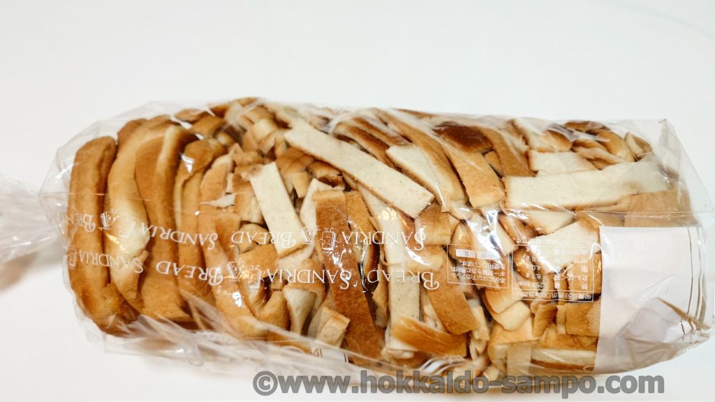 家に持って帰ってきて再度撮影。やっぱりおおきい!細長く切り落としたもののみならず、食パンの一斤の端まるごと切り落とした大きなものもたくさん入っています。