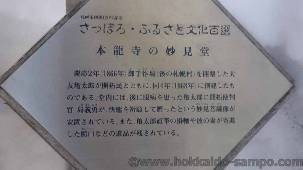 札幌村といえば大友亀太郎さんなのですが、その大友亀太郎さん所縁のお寺本龍寺なのだそうです。開山は安政年間にも遡るそうで、慶応4年に大友亀太郎さんにより妙見堂が建立されています。