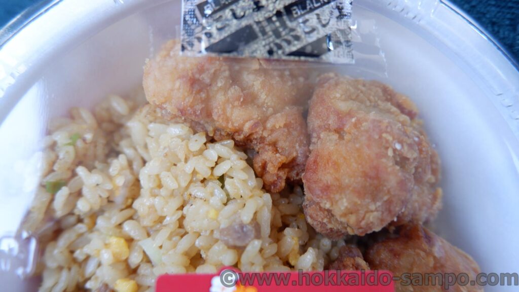 そしておそらくこの商品を手に取る方が炒飯以上に楽しみにしているであろう、からあげ(ザンギ)のおいしさが圧巻。お肉が柔らかくジューシー系。そして大きい。3つも入っている。言うことなし!申し訳程度のザンギがのっているという感じのお弁当ではなくて、いいの?っていうほど大きなのがゴロゴロと入っているので嬉しいです。このザンギのおいしさはセイコーマートホットシェフの得意とするところですね。もともとホットスナックコーナーでフライドチキンを主軸商品に抱えていましたから、技術が活かせているという感じがします。