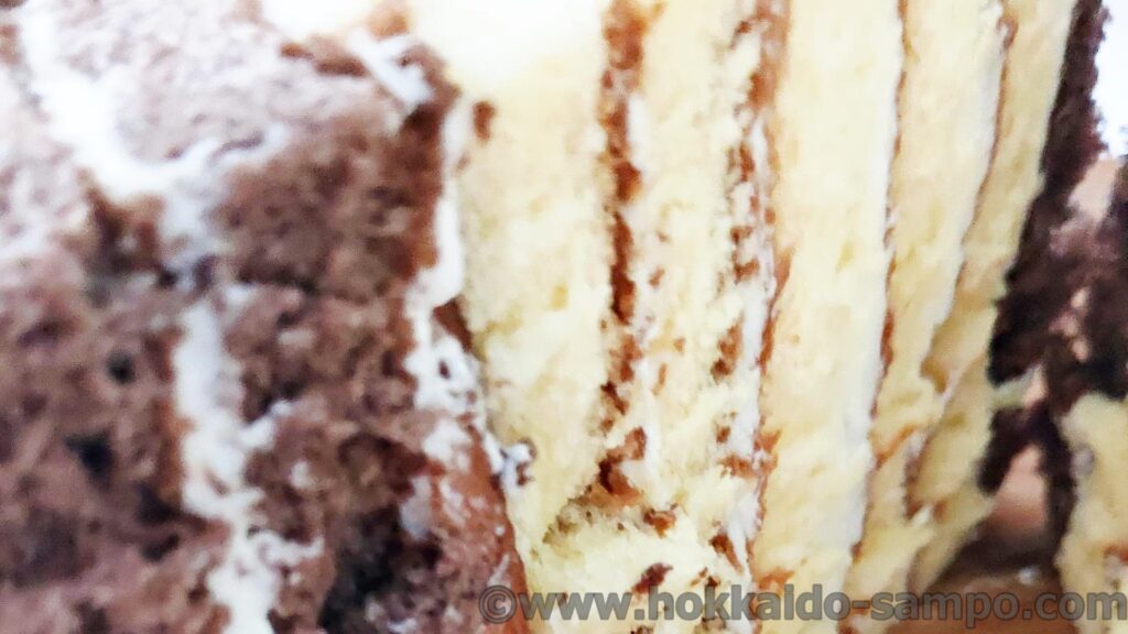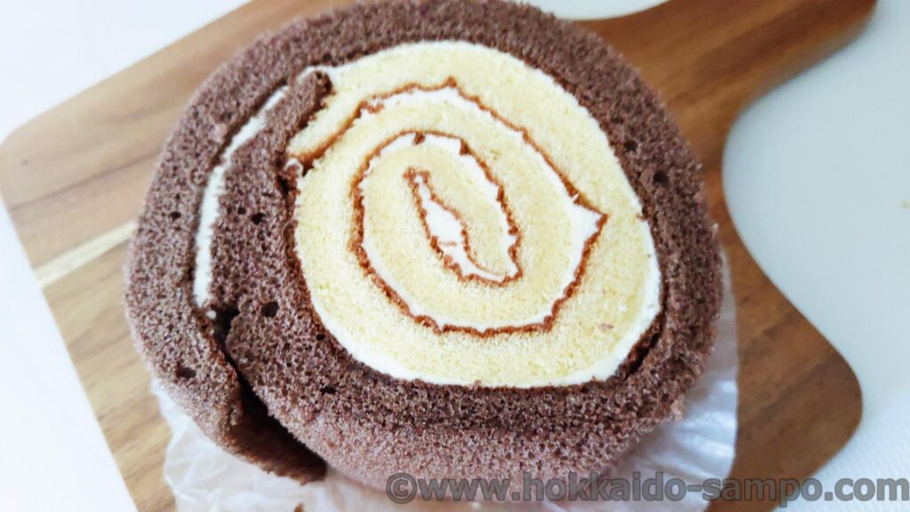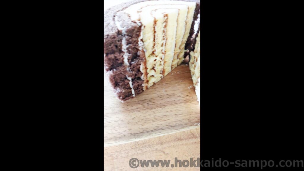 パッと見バニラ生地の方が多く見えますけどどうなんでしょうね。チョコは外側なので円周の長さは大きくなるし、ちょうど半分なのかな。