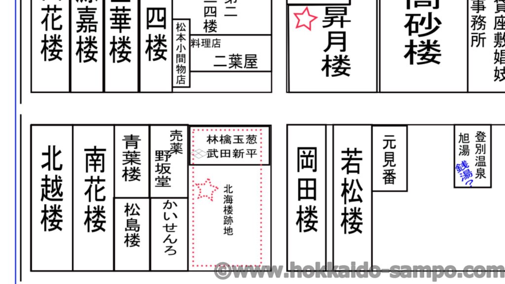 旭川の遊廓にも明治33年時点で「北越楼」という妓楼があったようですがおそらく偶然同じ名前で経営は別なのではないでしょうか(と今のところ考えています)。
