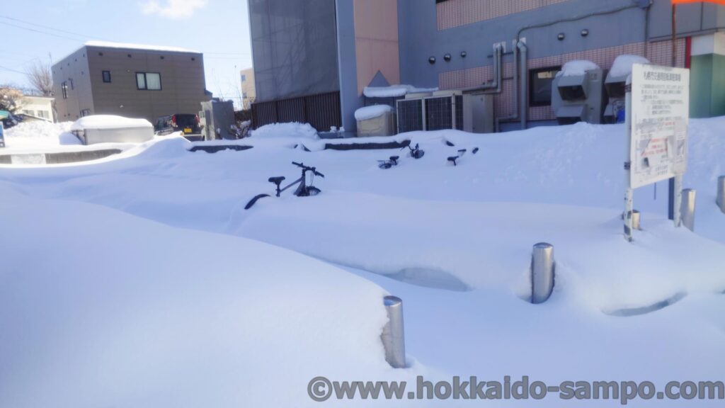 駐輪場。自転車が顔を出し始めている。春はもうすぐだ(適当)。